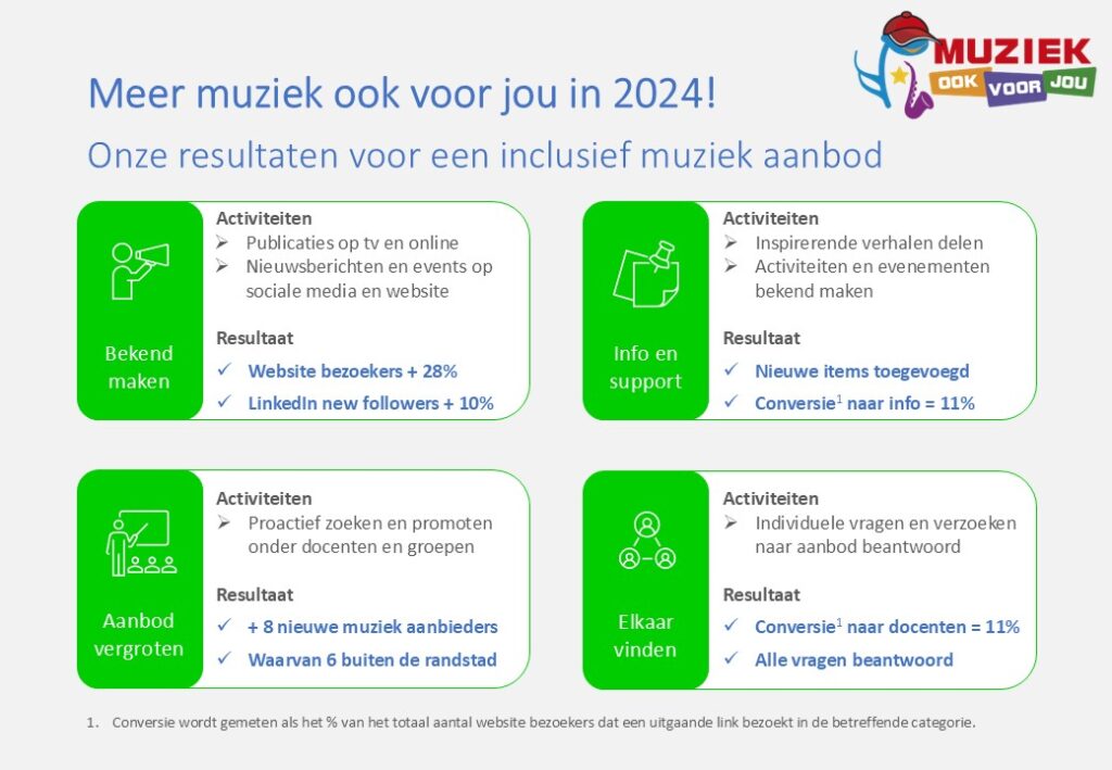 Sindsdien wordt er elk jaar hard gewerkt om de inclusieve muziekwereld een stap verder te brengen. Klik op de links hieronder om per jaar te zien wat we bereikt hebben op elk van onze vier doelen: promotie, informatie verstrekking, vraag en aanbod bij elkaar brengen en het vergroten van het aanbod van muziek.